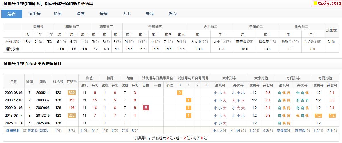 303期福彩3D试机号128对应开奖号的组选分析结果
